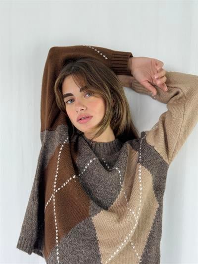 Retrobird Kahve Şardonlu Baklava Dilim Triko Kazak (ONL2012983)