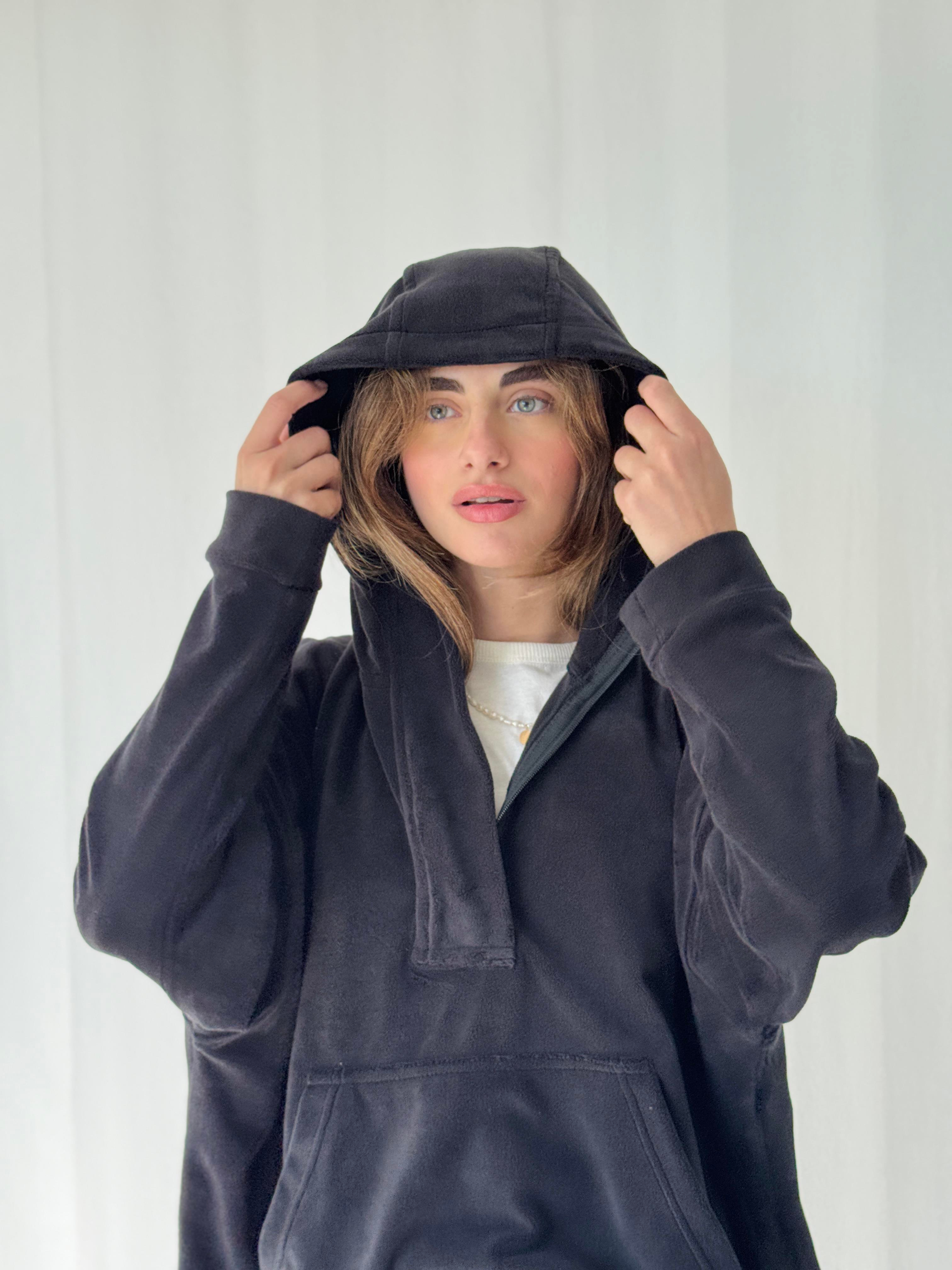 Retrobird Polar Kumaş Oversize Kapüşonlu Siyah Sweatshirt (ONL2013055)