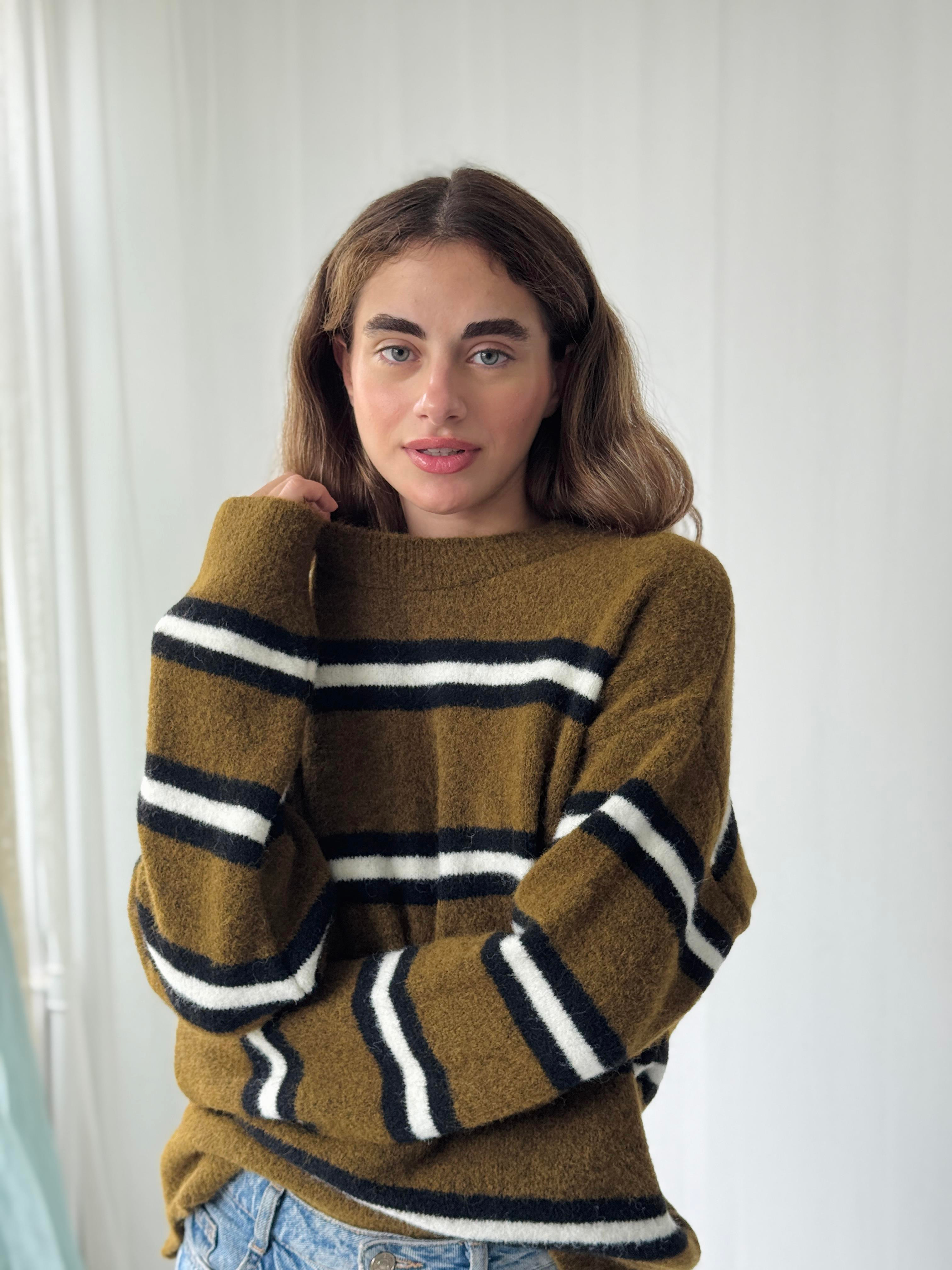 Retrobird Tütün Rengi Şardonlu Çizgili Triko Kazak